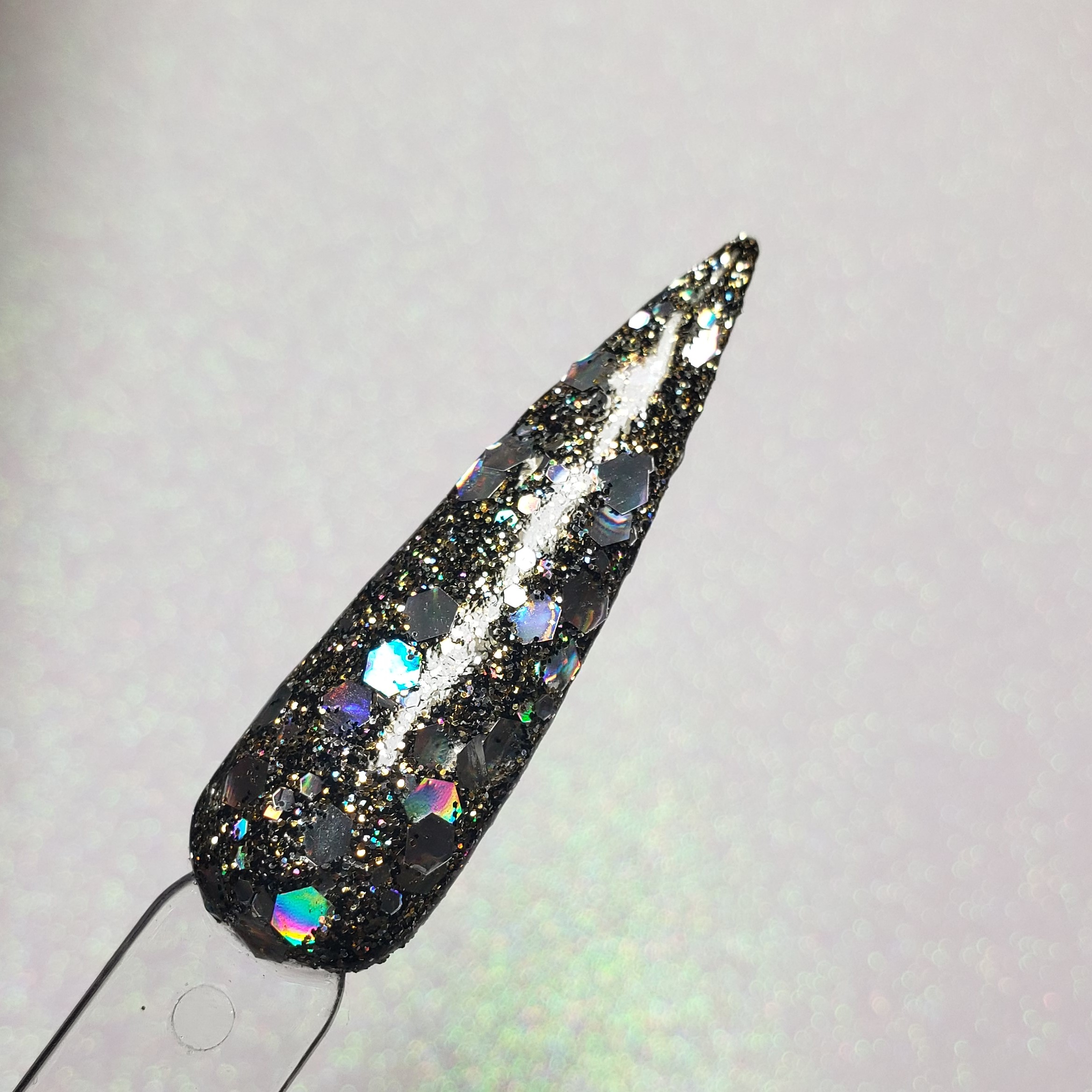 A multicolored, holographic glitter base with a chunky mix of larger silver holographic glitters.