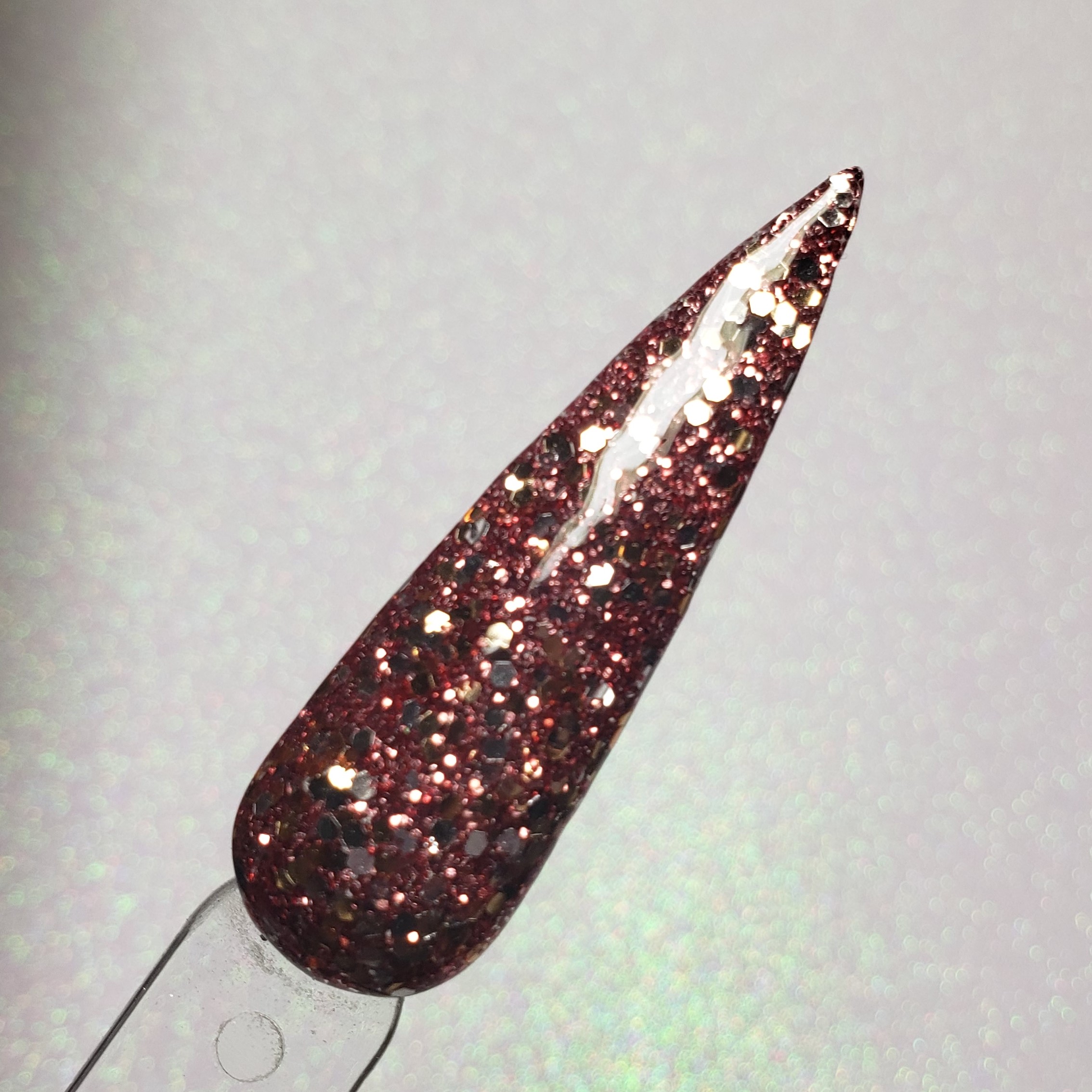 A black base with a chunky silvery/gold glitter, and pink foils.