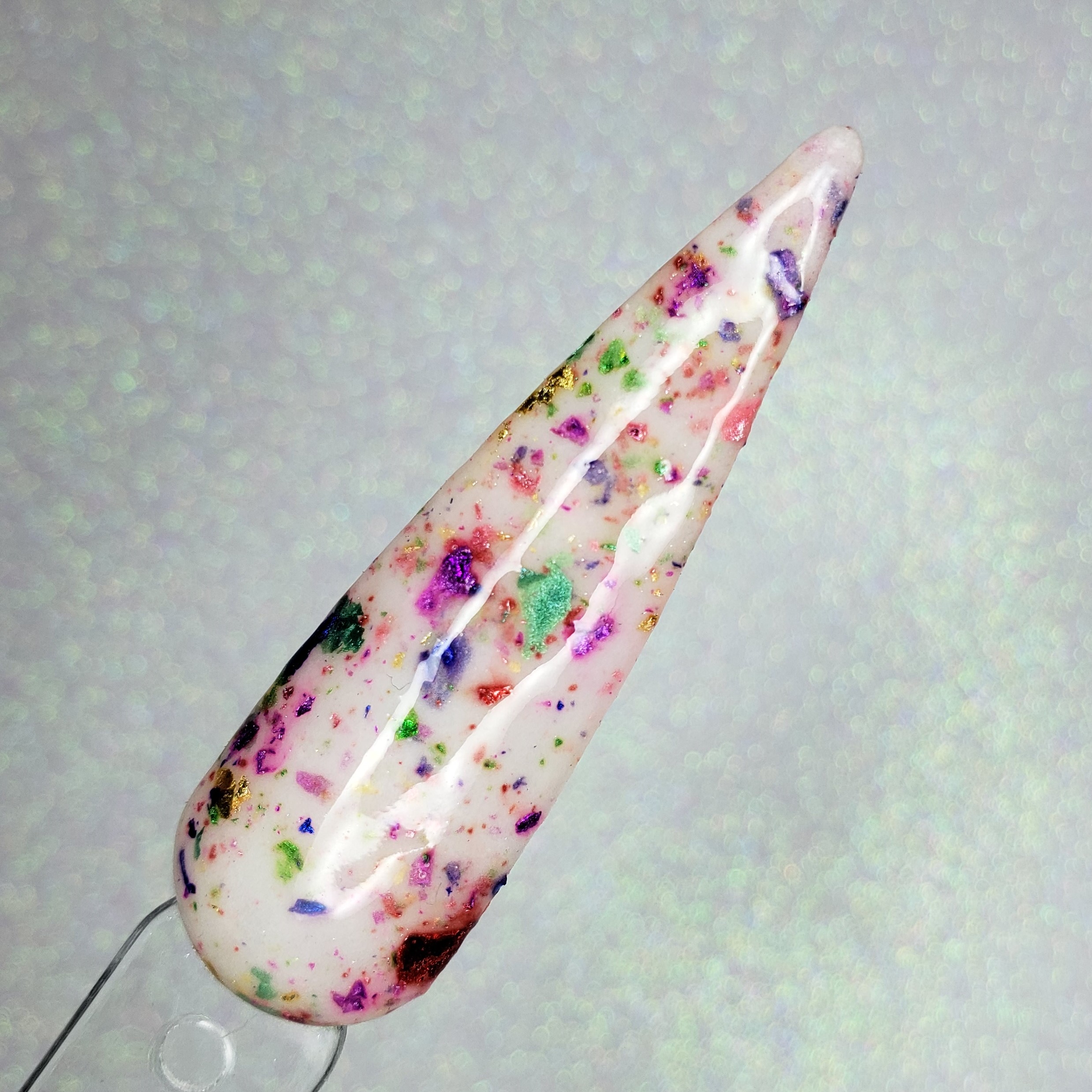 A blend of multicolored foils in a milky white base.
