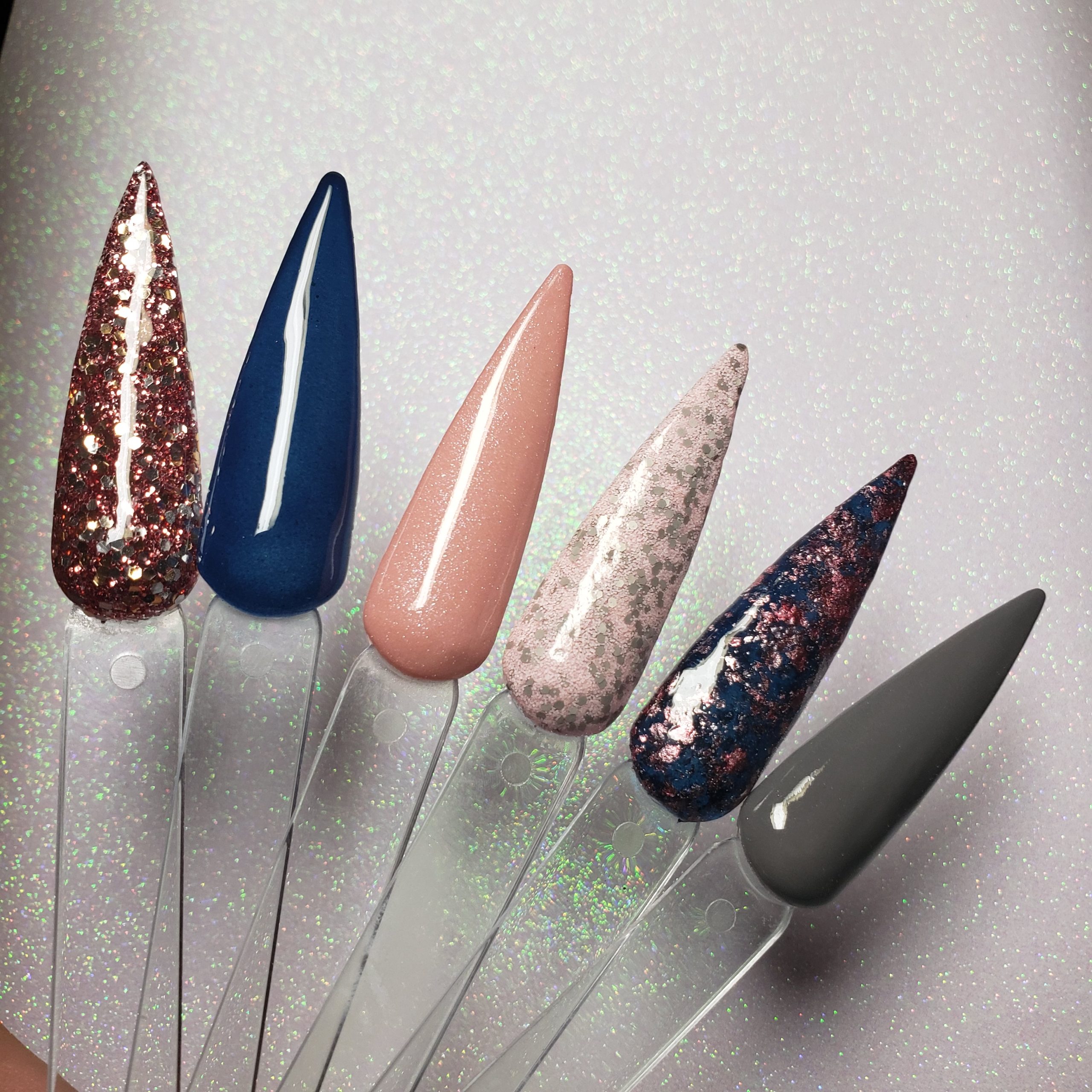 A navy, grey and pink collection. Solids, shimmers, glitters, and foils.