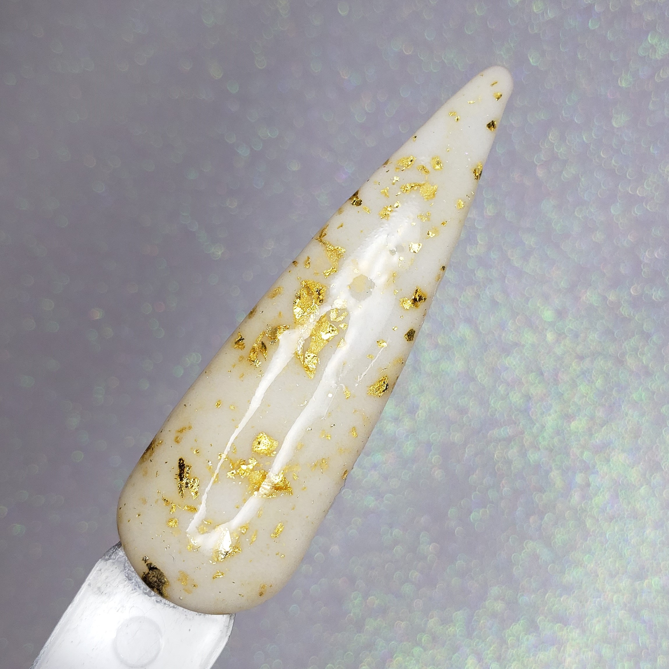 A creamy base with gold foils when warm. A slightly pinkish beige when cold.