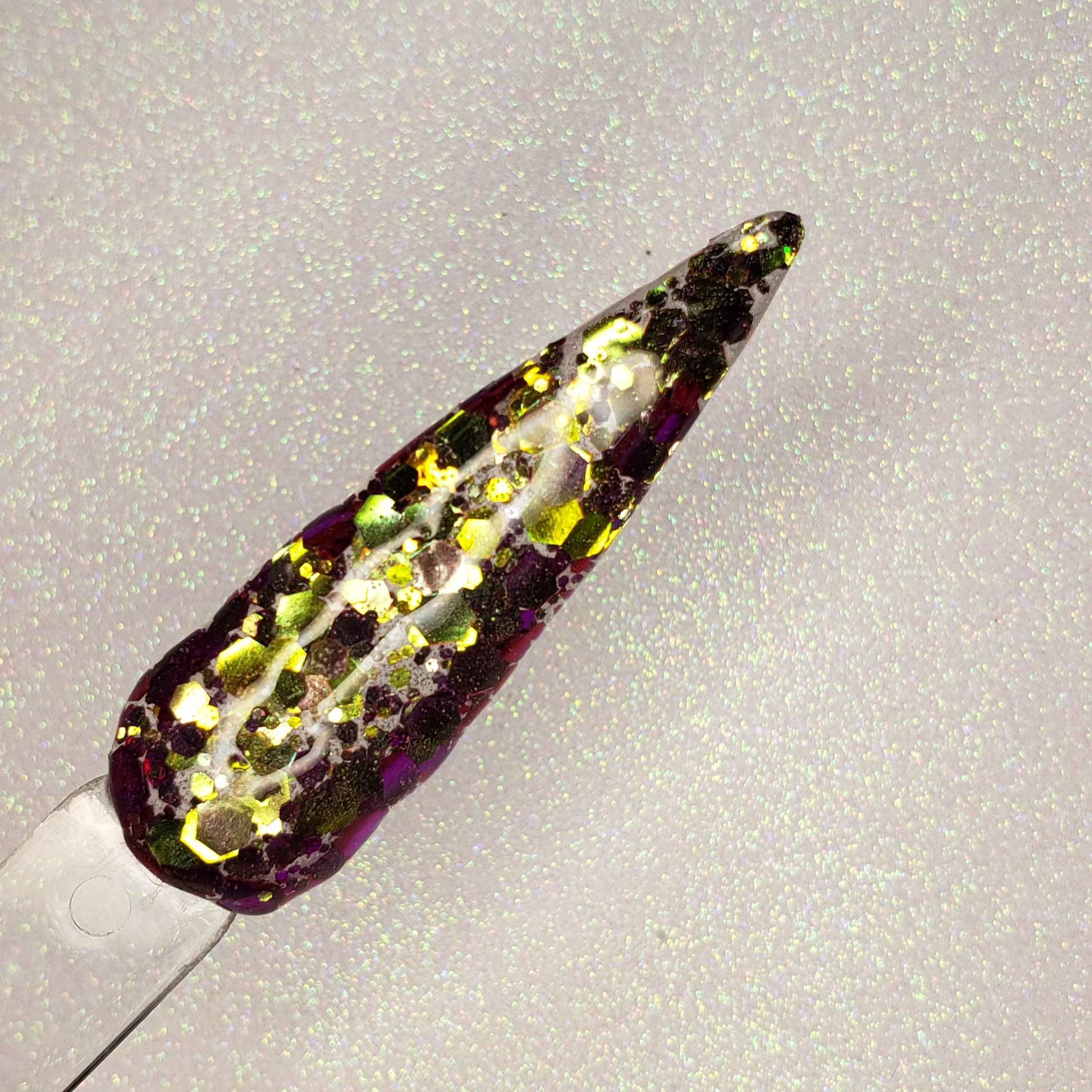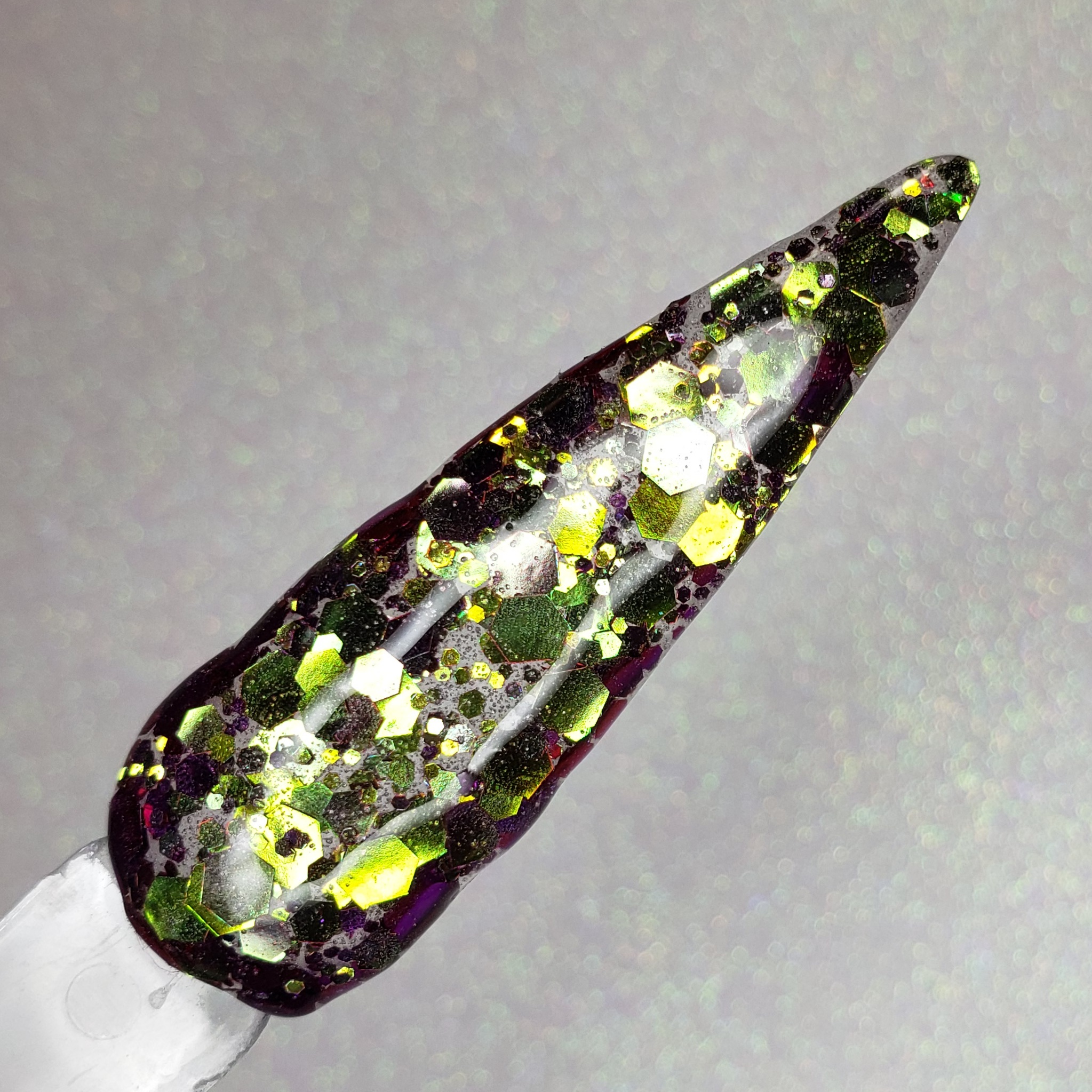 A chunky mix of deep purple, that shifts to a lemon lime color.