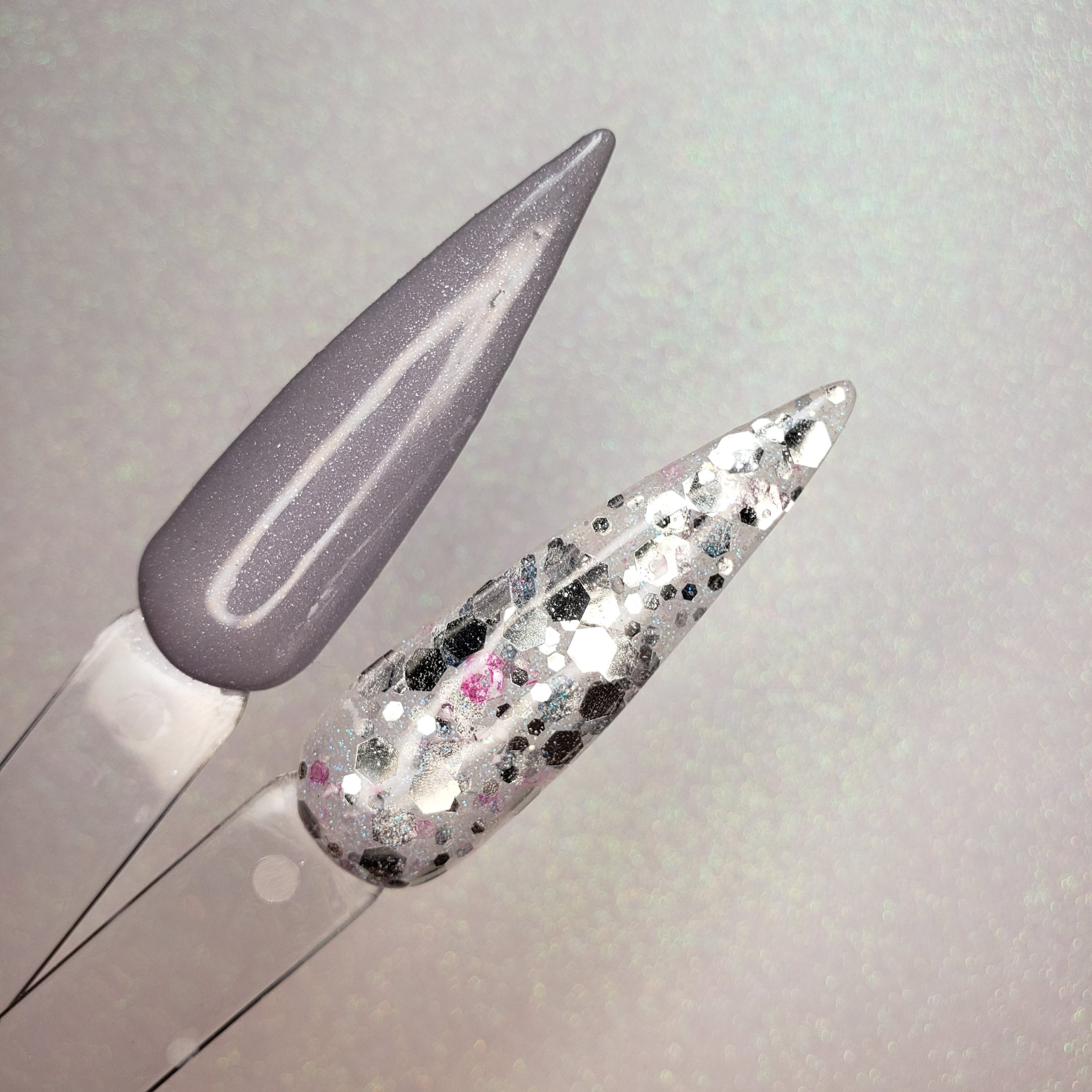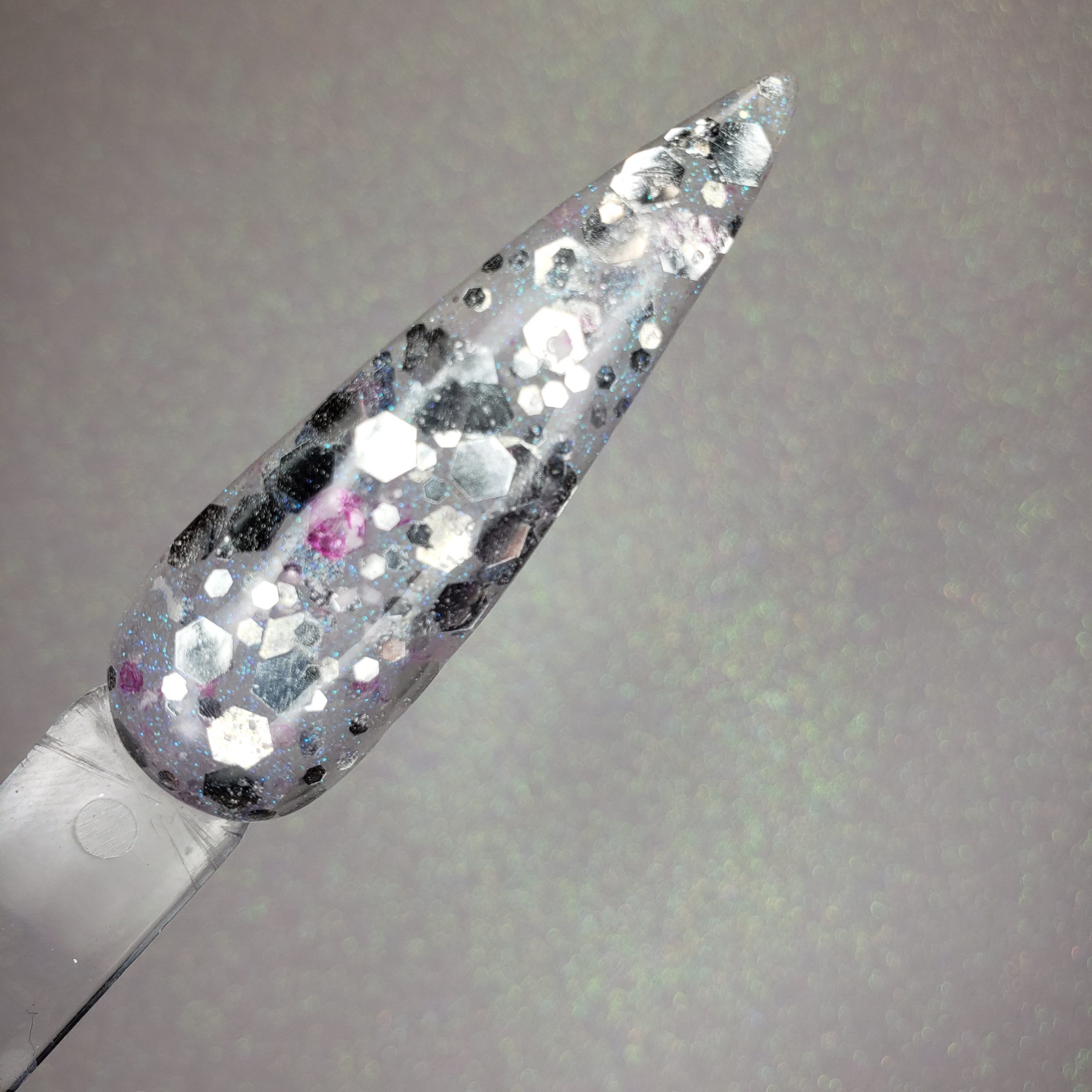 A chunky mix of silver and sheer pink with a shimmery blue base.
